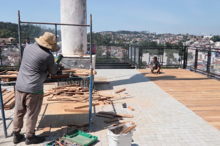 Durante a manhã desta segunda-feira (4), cerca de 15 trabalhadores atuavam em todo o mirante. Além da montagem do deque de madeira, os profissionais também estão instalando a parte elétrica, que garantirá a iluminação do local, e concluindo a instalação dos banheiros.