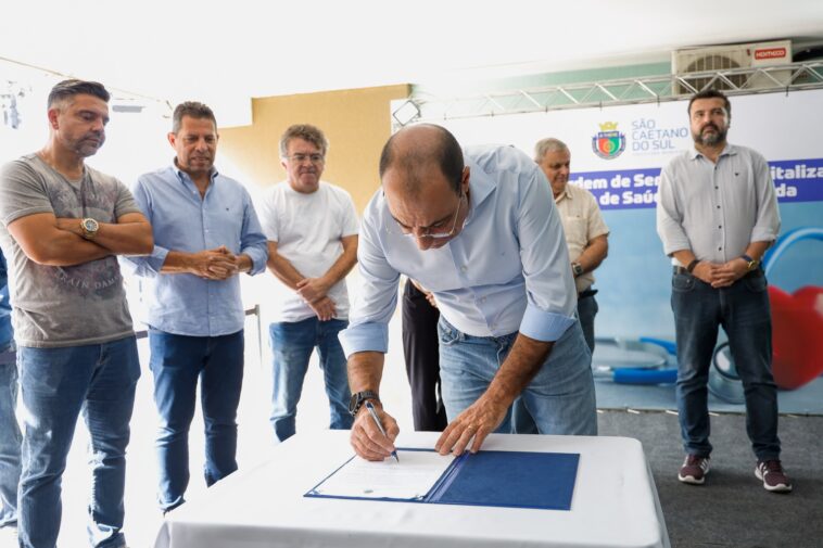 O prefeito de São Caetano do Sul, José Auricchio Júnior, e a secretária de Saúde, Regina Maura Zetone, assinaram nesta sexta-feira (12/4) a Ordem de Serviço para revitalização e ampliação do Complexo de Saúde Especializada, formado pelo Centro de Oncologia, Hospital de Olhos e o Mover Transporte Sanitário, que será instalado no local. O espaço, localizado na esquina da Rua Peri com a Avenida Vital Brasil Filho, no Bairro Oswaldo Cruz, receberá investimento de R$ 762,4 mil e deve ser entregue até final de julho.