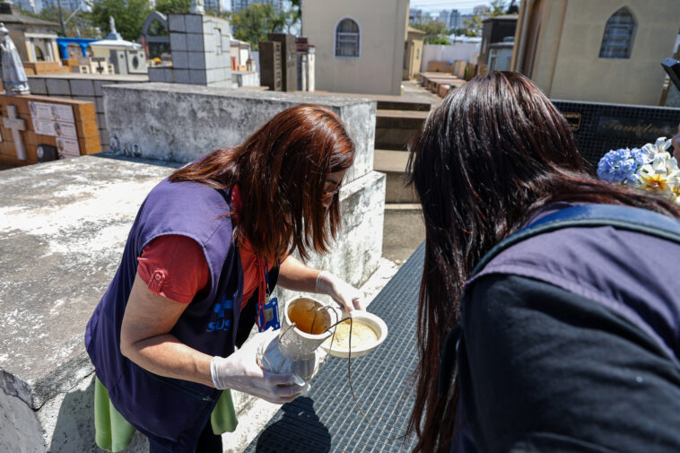 Na manhã desta quarta-feira (12/11), os agentes do CCZ e os estudantes da USCS visitaram os cemitérios São Caetano, no Bairro Santa Paula, e da Saudade, no Bairro Cerâmica. Ambos os locais integram os pontos estratégicos da cidade, que são vistoriados quinzenalmente por conta da elevada oferta de recipientes em condições de se tornarem criadouros do inseto.